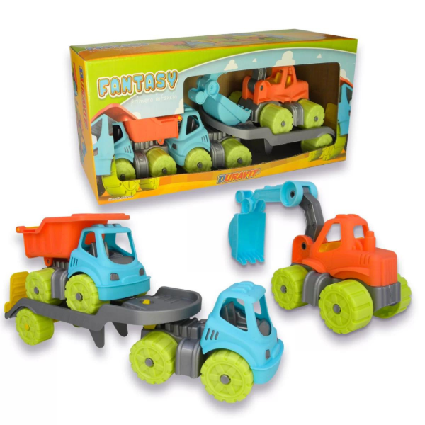 El combo incluye: camión volcador, retroexcavadora y camión con trailer.